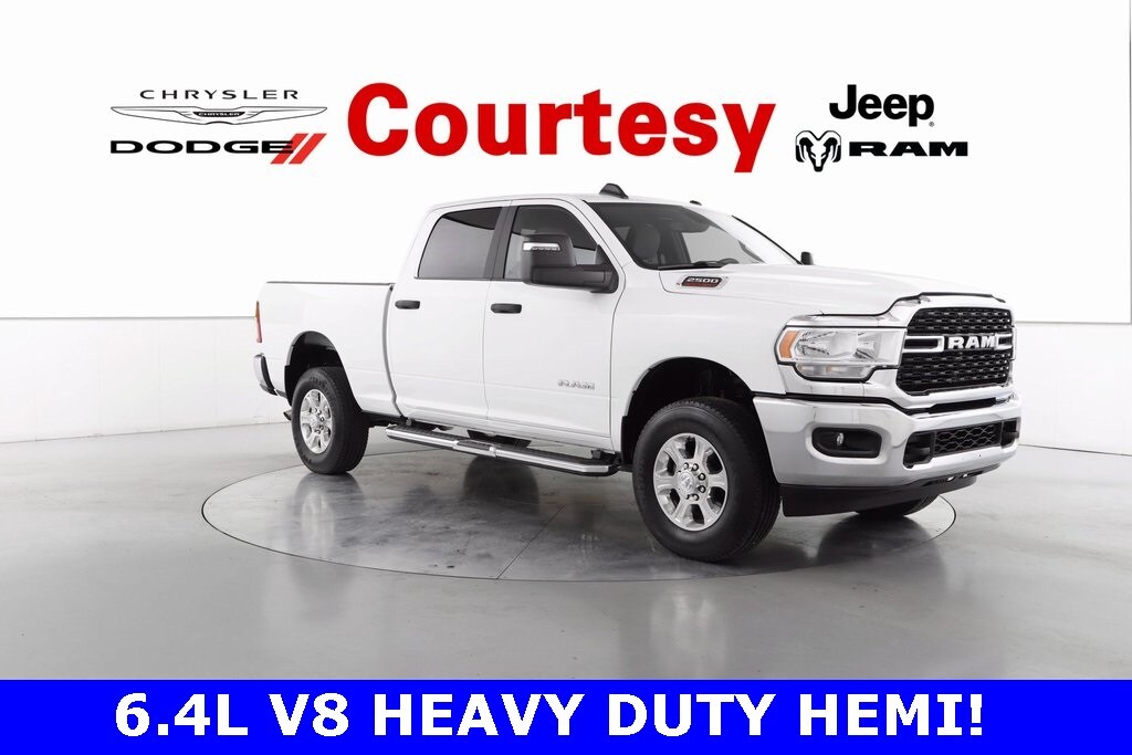 REMAINING FULL FACTORY WARRANTY!, FULLY SERVICED AND READY TO GO!, FACTORY BACKED CERTIFIED WARRANTY. HAS A BETTER WARRANTY THAN A NEW ONE!, 2500 Big Horn, 4D Crew Cab, 6.4L V8, 8-Speed Automatic, 4WD, Bright White Clearcoat, Diesel Gray/Black Cloth, 2 Way Rear Headrest Seat, 2nd Row In Floor Storage Bins, 4 Way Front Headrests, 40/20/40 Split Bench Seat, 8.4" Touchscreen Radio, Android Auto, Apple CarPlay, Auto Power-Folding Mirrors, Big Horn IP Badge, Black Exterior Mirrors, Bluetooth Handsfree Phone & Audio, Center Hub, Connectivity - US/Canada, Dual Glove Boxes, Exterior Mirrors Courtesy Lamps, Exterior Mirrors w/Heating Element, Exterior Mirrors w/Supplemental Signals, Foam Bottle Insert (Door Trim Panel), Fog Lamps, Footwell Courtesy Lamp, For Details, Visit DriveUconnect.com, For More Info, Call 800-643-2112, Forward & Reverse Utility Lights, Front Armrest w/Cupholders, Front Center Seat Cushion Storage, Front Seat Back Map Pockets, Global Telematics Box Module (TBM), Glove Box Lamp, GPS Antenna Input, Integrated Center Stack Radio, Leather Wrapped Steering, Level 1 Equipment Group, Locking Lower Glove Box, Manual Adjust 4-Way Front Passenger Seat, Mirror Running Lights, Power 2-Way Driver Lumbar Adjust, Power Adjust 8-Way Driver Seat, Power Adjust Mirrors, Power Adjustable Convex Aux Mirrors, Power Heated Fold Telescope Mirrors, Power Telescoping Mirrors, Premium Cloth 40/20/40 Bench Seat, Quick Order Package 2GZ Big Horn, Radio: Uconnect 5 W w/8.4" Display (A62), Rear 60/40 Folding Seat, Rear Dome w/On/Off Switch Lamp, Remote USB Port - Charge Only, Selectable Tire Fill Alert, SiriusXM, SiriusXM Radio Service, Steering Wheel Mounted Audio Controls, Storage Tray, Voice Command w/Bluetooth, Wheels: 18" x 8.0" Polished Aluminum, Wi-Fi.