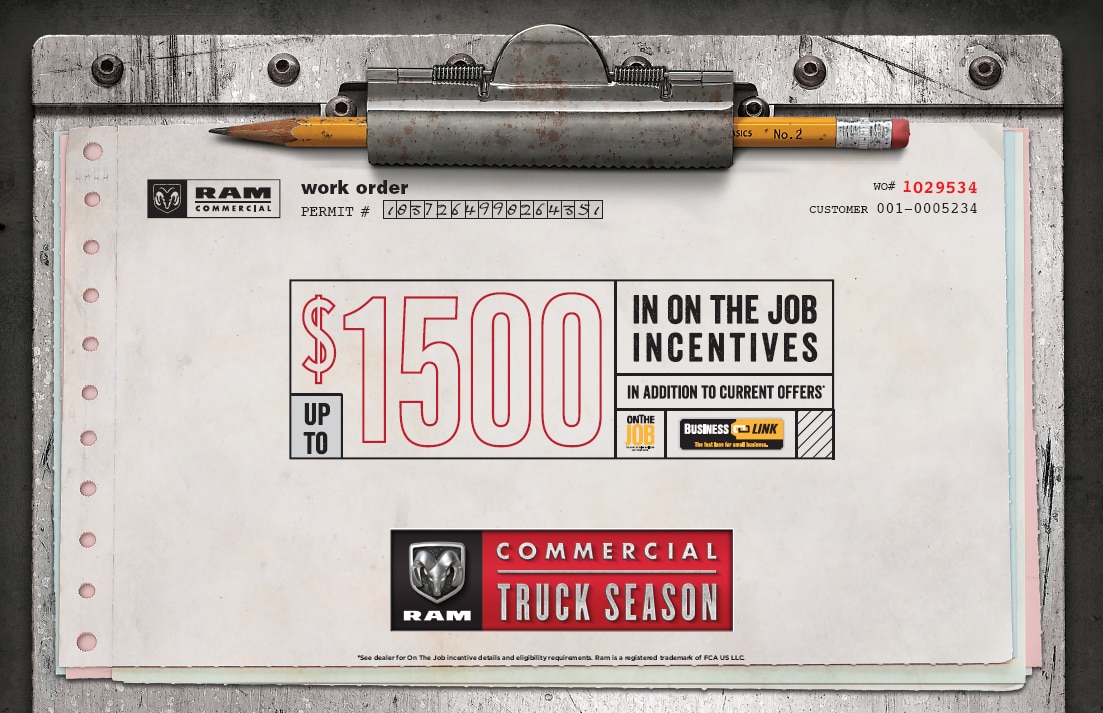For example, when it comes to our 2015 and 2016 Ram Commercial Vehicles, you'll receive an additional $500 On the Job bonus cash to put back in your pocket. Then you'll be able to choose from one of the following deals:Â