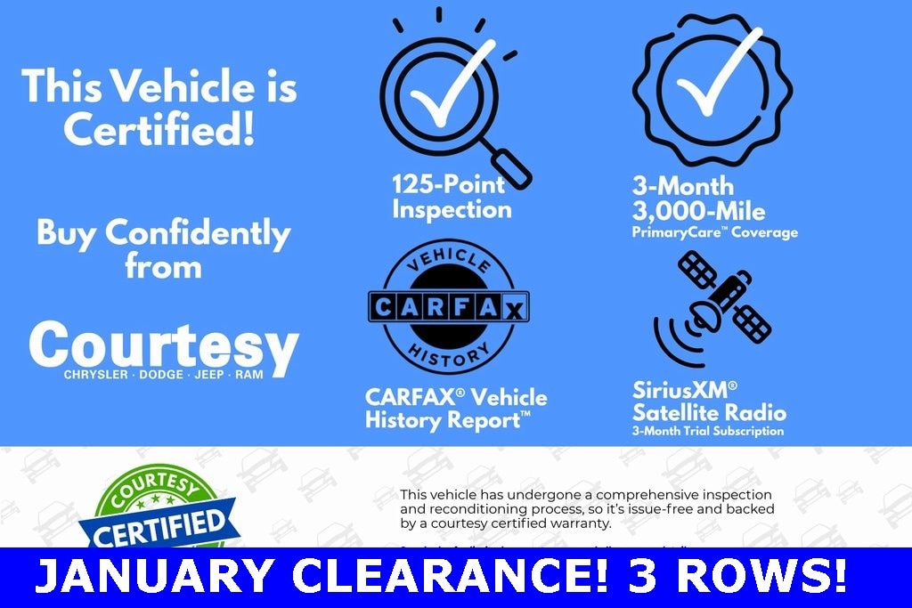 Certified. Certification Program Details: Every Courtesy Care Certified vehicle goes through a meticulous 125-point inspection and comprehensive reconditioning process. Your purchase includes our 3-Month/3,000-Mile PrimaryCare Warranty for added peace of mind. Youâll also enjoy additional benefits, including: CARFAX® Vehicle History Report 3-month SiriusXM® trial (when available)